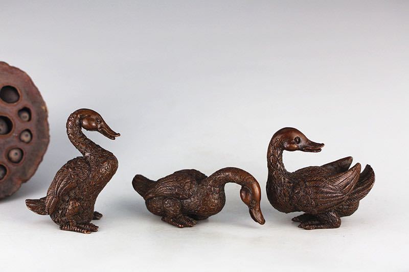 - 希少品 極美古銅香炉質感 細工 実心実感ガチョウ群三匹セット 親情、愛情の群がる家族 自由自在無憂無愁のんびりしてる生活 縁起物