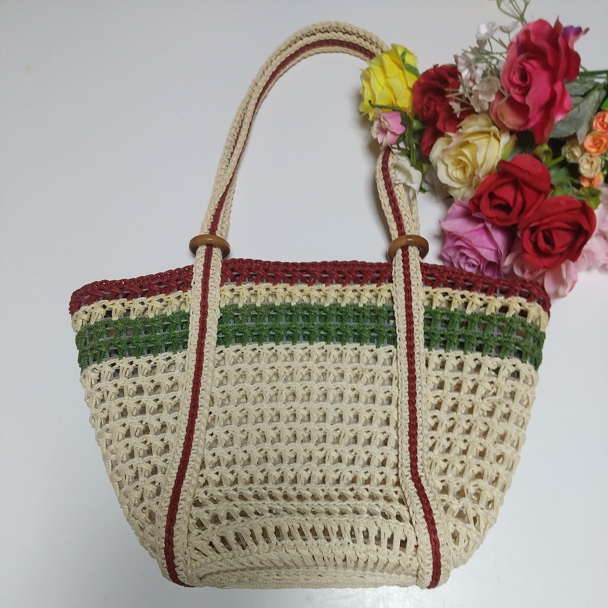 - (新品)最終値下げ価格!赤 オフホワイト グリーンのトリプルカラーが可愛い!手編みかごバッグ 43×28×12㎝☆★