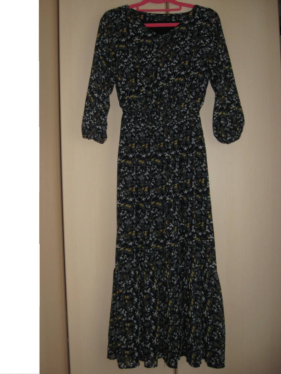 - 送料無料即決 クリア clear ロングワンピース 7分袖 紺色花柄 シフォン M~L