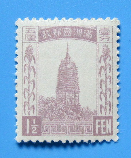 > 満州 普通切手 満州国郵政 1 1/2分 1分5厘 裏のり ヒンジ跡 少し折れ 丸まり すかし無し 未使用