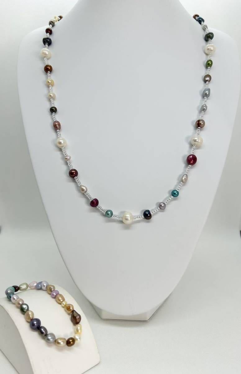 - 【新品未使用】淡水パールロングネックレス・ブレスレットセット/淡水真珠/バロックパール/マルチカラー/6月の誕生石