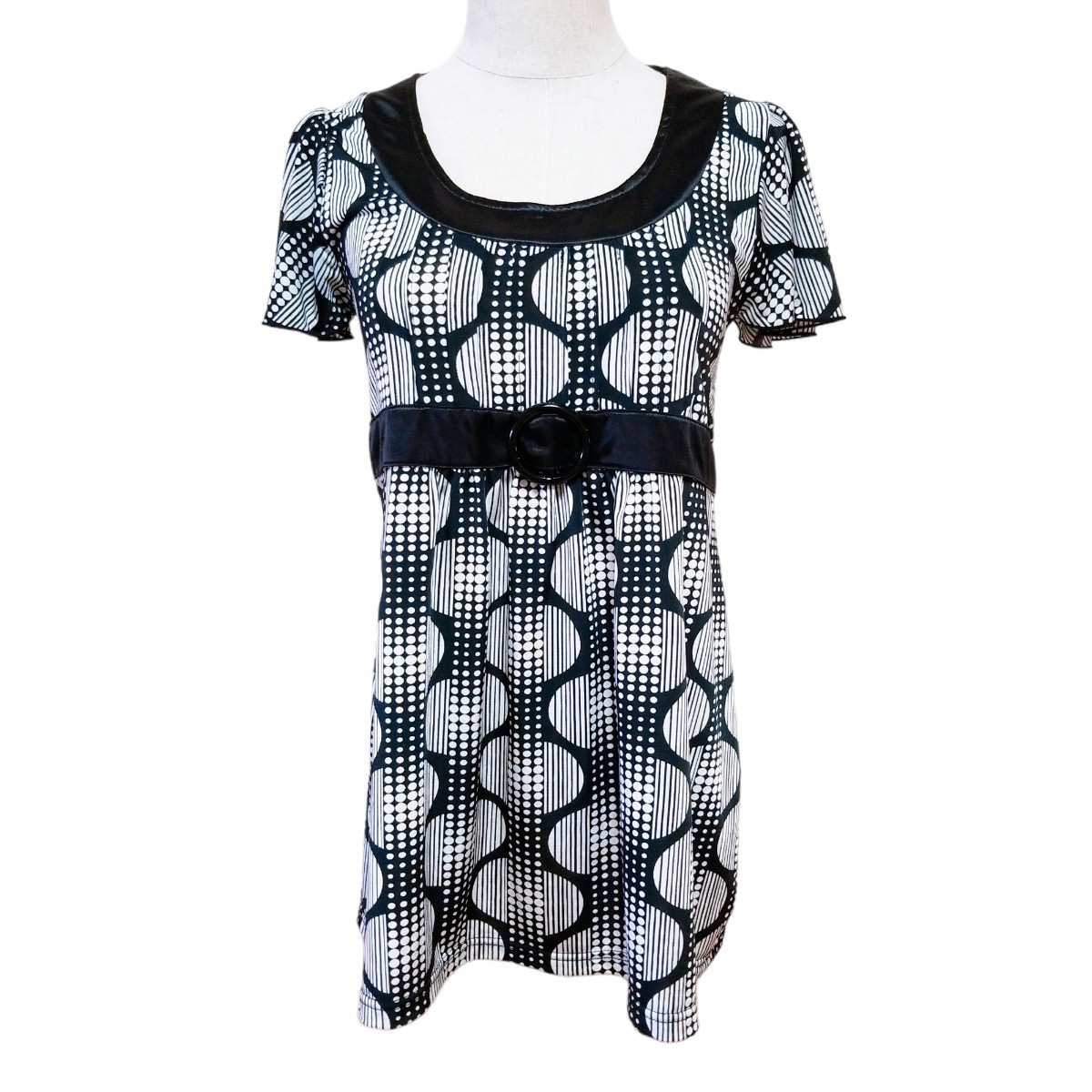 - Y591【美品】ハイストレッチチュニック ロングカットソー 半袖 フリル 総柄 モノトーン レディース M ブラック×ホワイト ツルツル とろみ
