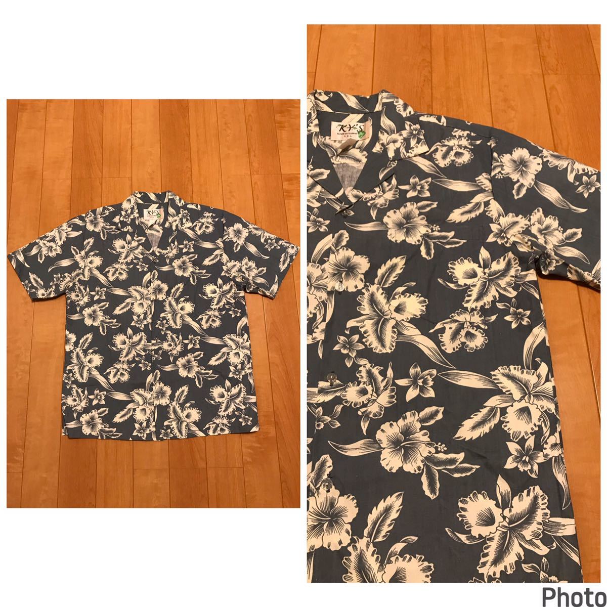 - 良品☆HAWAII.USA製/KY'S メンズサイズM大き目.日本XL〜並 半袖開襟アロハシャツ 花&葉っぱ.ハワイアン総柄 オールド Hawaiian ALOHA