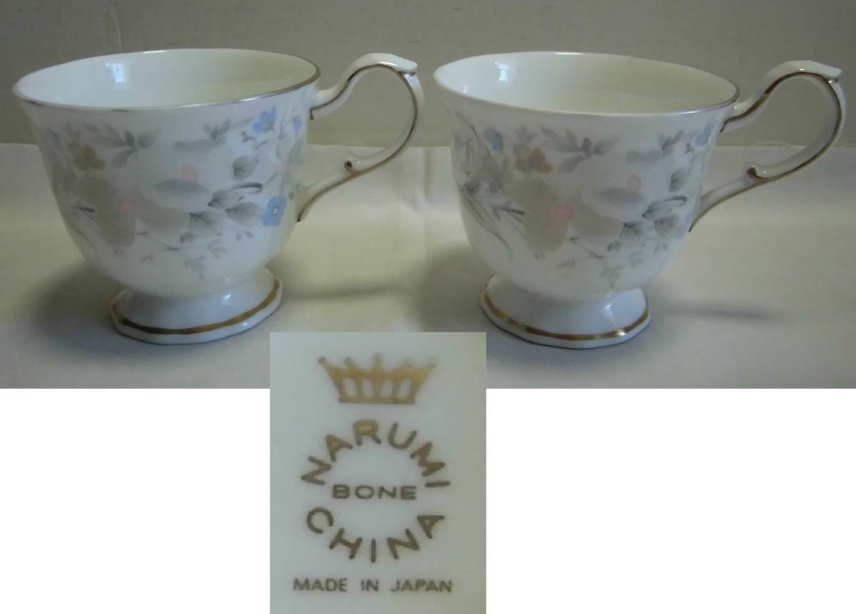 > 古い カップ NARUMI ナルミ ボーンチャイナ 2客 高台 花柄 白磁に色絵 金線 ティー コーヒーカップ 工芸品 茶器 レトロ アンティーク