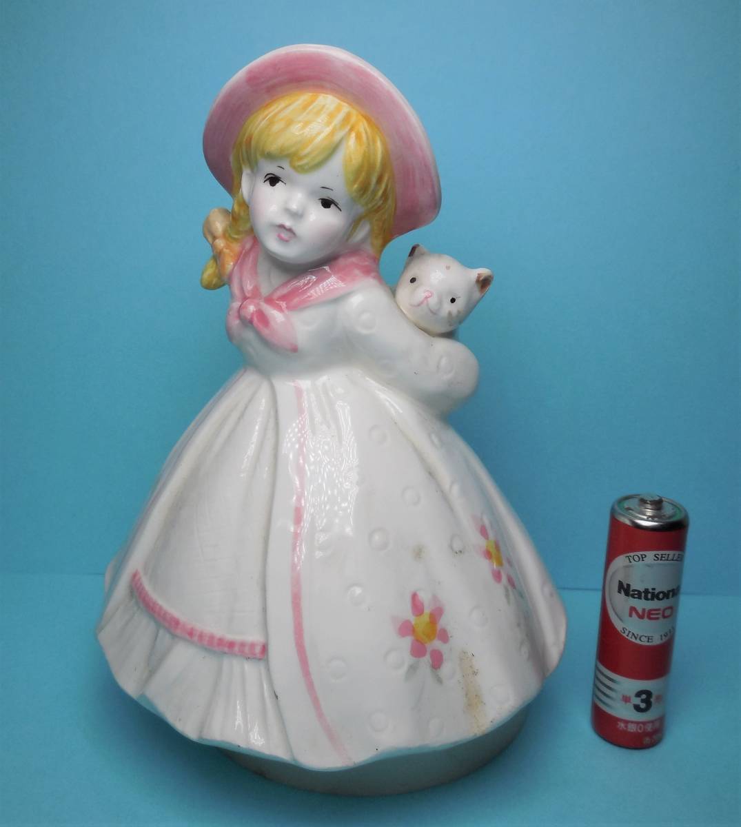 - ネコを背負うドレス姿の女の子 陶製 人形 オルゴール 日本製 SANKYO 愛のオルゴール 曲