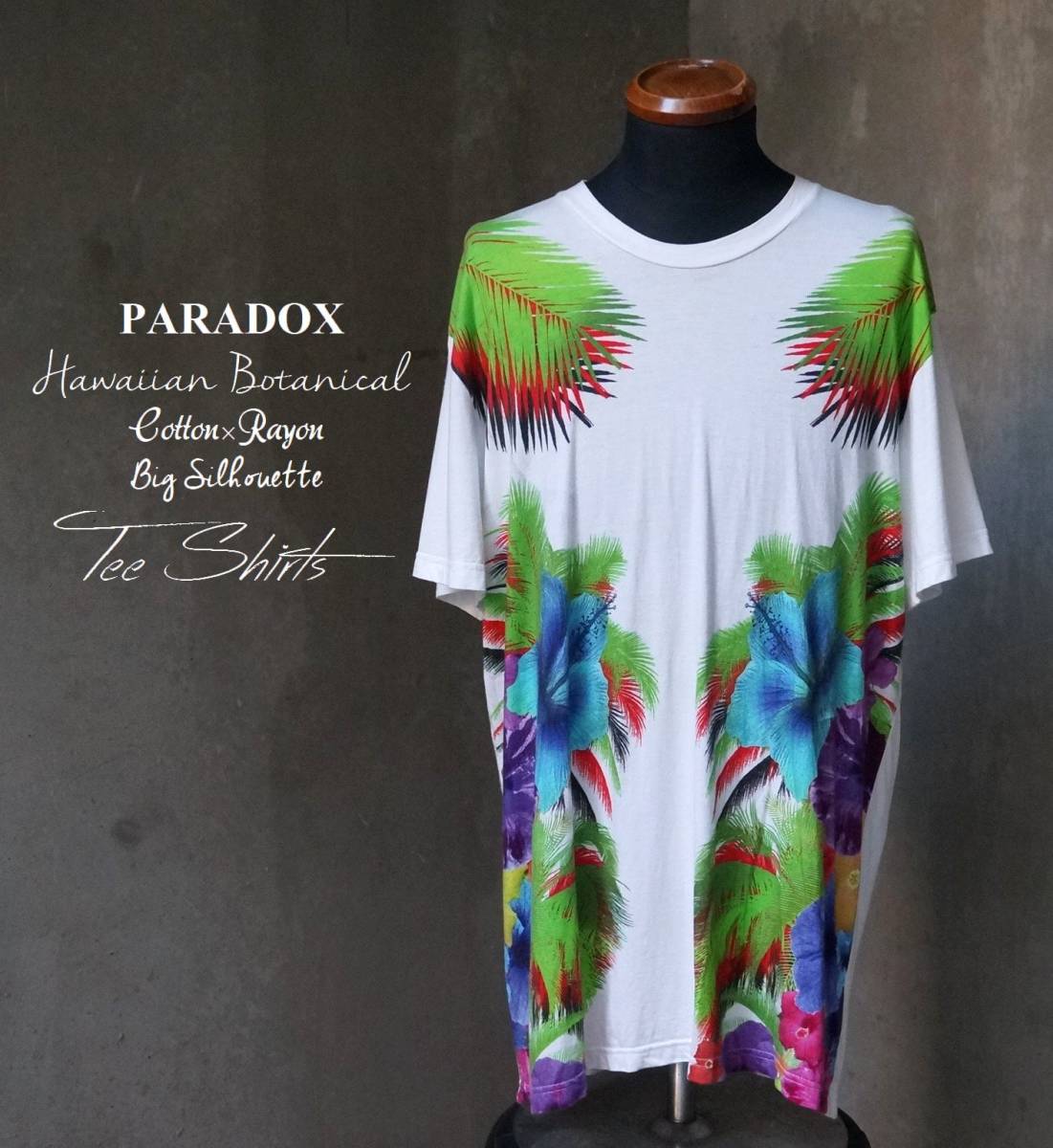 > パラドックス PARADOX 白 コットン レーヨン ハワイアン ボタニカル アロハ柄 Tシャツ F オーバーサイズ ビッグシルエット