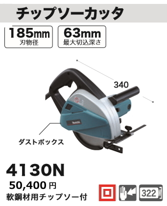 マキタ チップソーカッタ 4130N 定価50,400円(税別) ■最適回転数&高トルク化により刃物寿命向上 ■刃物外径185mm 刃物内径20mm 最大切込深さ63mm ■付属品 軟鋼材用チップソー(A-33560) ・六角棒レンチ10 ・平行定規 ・セフティゴーグル