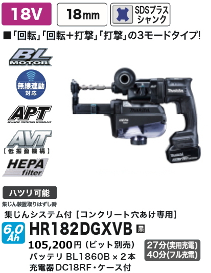 > マキタ 18mm 充電式ハンマドリル HR182DGXVB 黒 18V 6.0Ah 集じんシステム付 新品