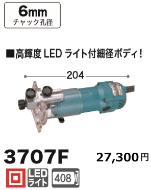 マキタ トリマ 3707F 定価27,300円(税別) ■高輝度LEDライト付細径ボディ ■主要機能 チャック孔径:6mm 回転数:35000[回転/分] 電流:4.6A 消費電力:440w 質量:1.2kg コード:2.5m ■付属品 ストレートビット6 /ストレートガイド /テンプレートガイド /トリマガイド /スパナ10・17(各1本)