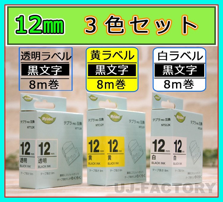 - ★即納/テプラPRO用互換テープカートリッジ/12mm幅×8m★3色セット/白x黒文字(SS12K相当)+透明x黒文字(ST12K相当)+黄色x黒文字(SC12Y相当
