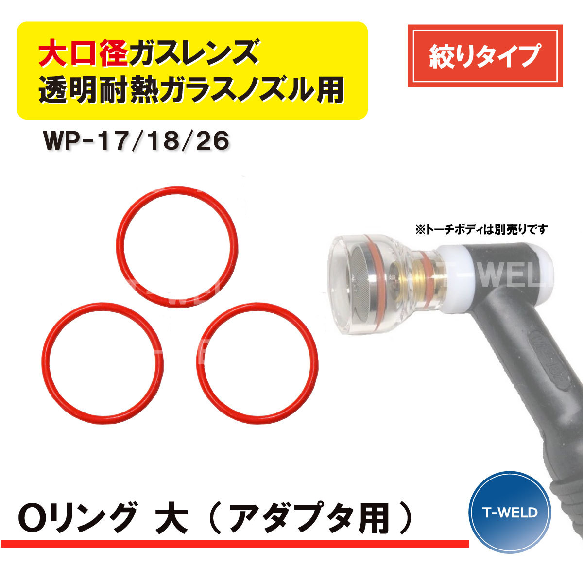 > TIG 溶接 WP-17/18/26 大口径ガスレンズ 絞りタイプ 透明耐熱ガラスノズル Oリング (大) 3枚 アダプタスクリーン網用