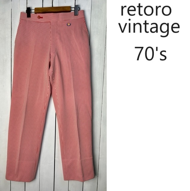 - 昭和レトロ古着 70s 赤細ストライプ スラックスパンツ 74 オールド ヴィンテージ ポリパンツ ブーツカット S程度 ユニセックス ゴルフ●346
