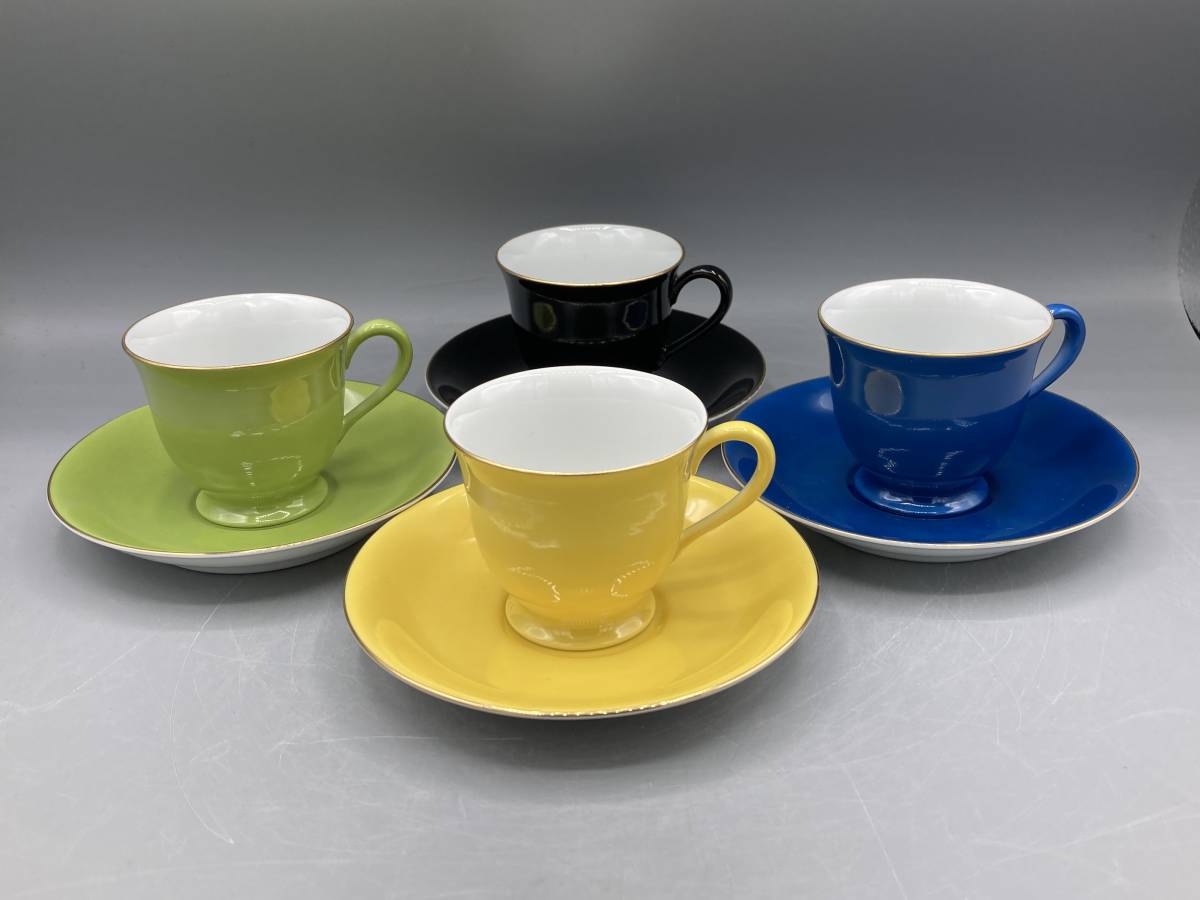 > オールドノリタケ 4客 カップ&ソーサー 黒 青 黄 黄緑 金彩 陶器 ノリタケ (#21)-(12)