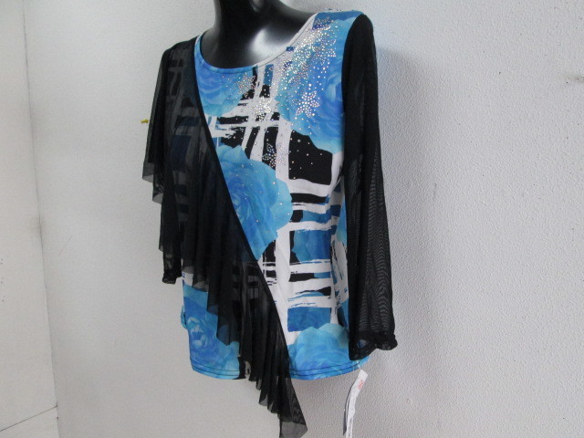- 新品●送料無料◎社交ダンス カットソー 前後ろ ネット重ね ライトブルー 薔薇プリント