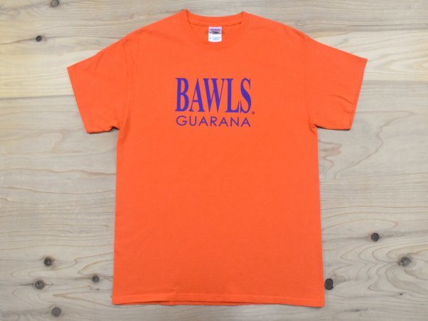 > レアUSA古着 BAWLS ボウルズ ロゴ Tシャツ sizeM オレンジ ゲーム 高カフェイン飲料 ガラナ 企業 会社 アメリカ アメカジ GILDAN