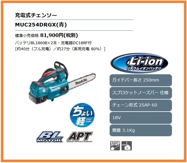 > マキタ 250mm 18V 充電式チェンソー MUC254DRGX (青) [6.0Ah]【スプロケットノーズバー仕様】 ■安心のマキタ純正/新品/未使用■