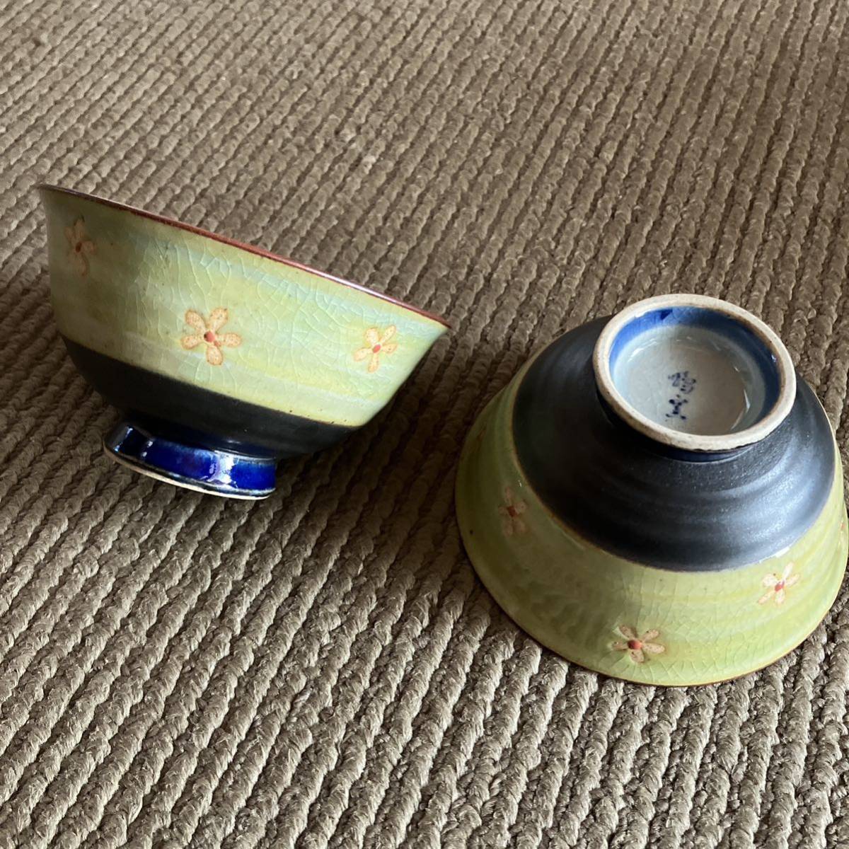 - 鳴窯 陶器 レトロ 茶碗 多目的椀 2個 花 緑 和食器