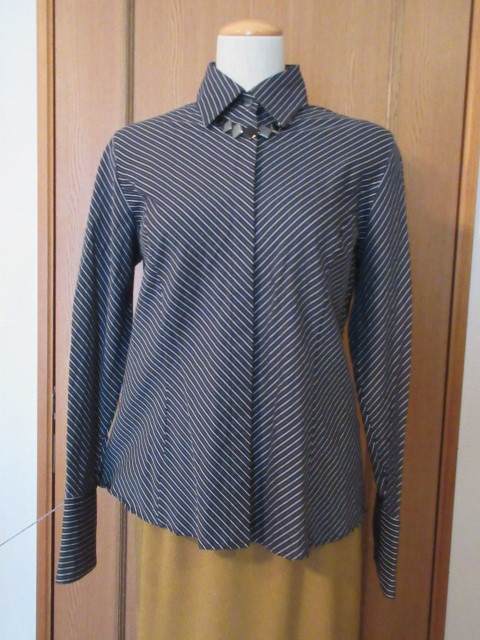 > Y)■日本製■【OPALI OPERA】■手洗い可能/綿69%■黒地ストライプのバイヤスCUT♪着易い伸縮♪■気品高い比翼仕立て♪■シャツブラウス