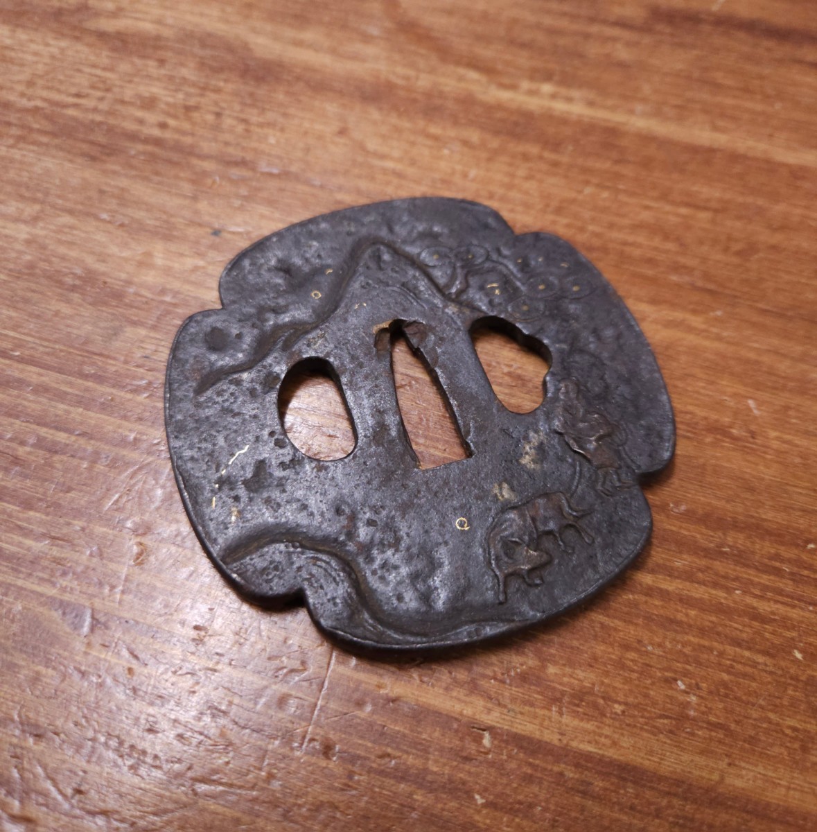 - 鍔 江戸時代 刀装具 金象嵌 日本のアンティーク 旧家蔵出し 和骨董 当時物 仙人 山水紋 A3