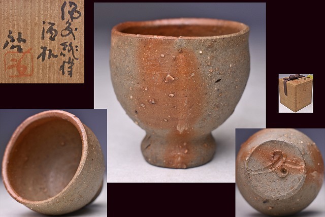 - 藤原啓 ★ 備前緋襷ぐい呑 ★ 共箱 ★ 上作 ★ ヒダスキ ★ 丁度よい大きさ ★ 人間国宝 ★ 藤原雄 の父