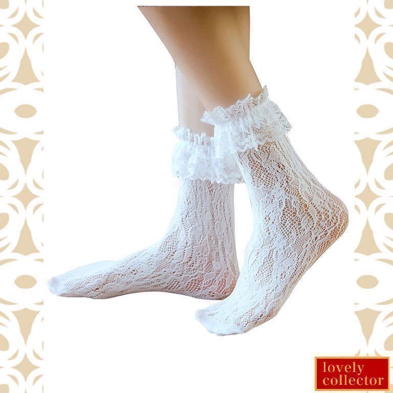 - レディースソックス レースソックス フリル ロリータ ジュニア 透かし ショットソックス 白 ホワイト