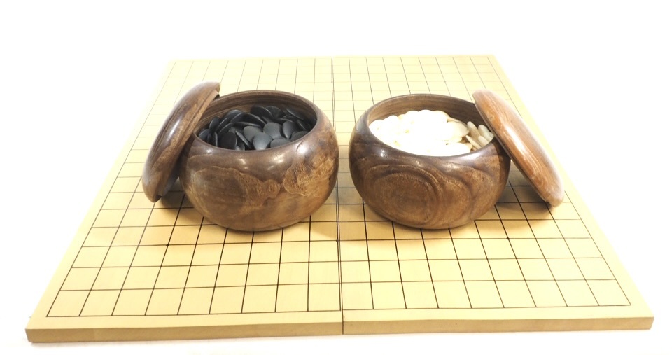 - 昭和ビンテージ 囲碁セット 任天堂製 木製折碁盤 本蛤碁石 那智黒碁石 木製碁笥 在銘品 CKY512
