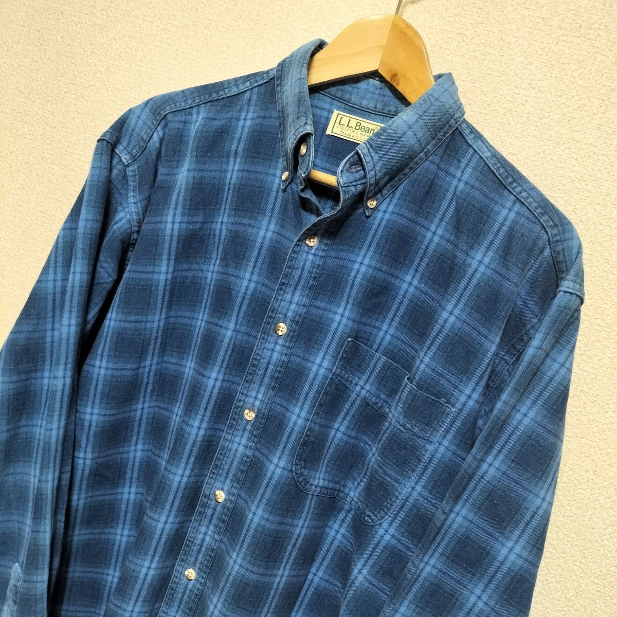 > 希少★80-90s USA製 L.L.Bean ボタンダウン コットンシャツ ブルー ネイビー チェック メンズ サイズM 長袖 エルエルビーン 稀 古着 USED