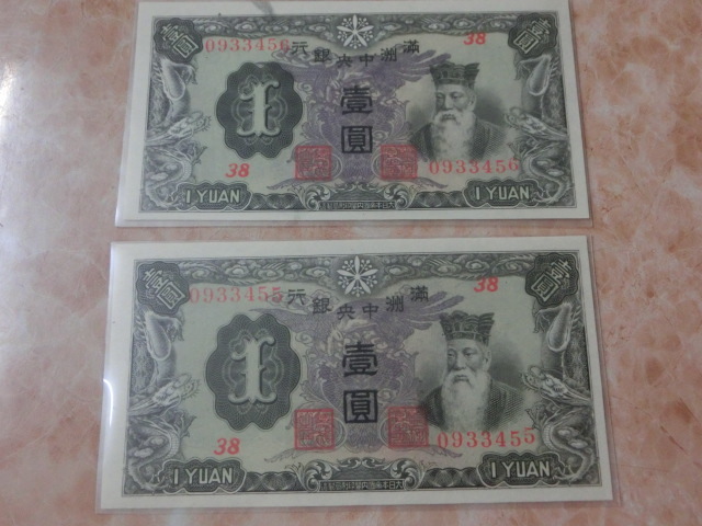 - ★ 満州中央銀行券 丙号券1円 未使用・連番 2枚 ★ No.490