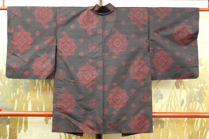 - きもの今昔6210 お羽織コレクション 大島紬地 横総絣黒地に臙脂色華文 しみ汚れ無 羽織紐付き 羽織丈83cm