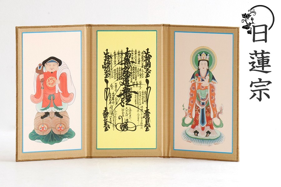 - 仏具 掛軸 掛け軸 台座 不要 ■ 日蓮宗 小 ■ 三枚 三幅 上仕立て 置き型 曼荼羅 中山鬼子母神 大黒天 高さ14.3cm