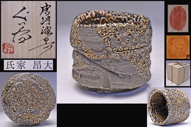 > 氏家昴大 ★ 唐津 漆黒 ぐい呑 ★ 共箱 共布 栞 ★ 上作 ★ 梅花皮 ★ 釉薬の縮れ ★ 酒器 ★ 大ぶり ★ 独創的 ★ 若手陶芸家 ★