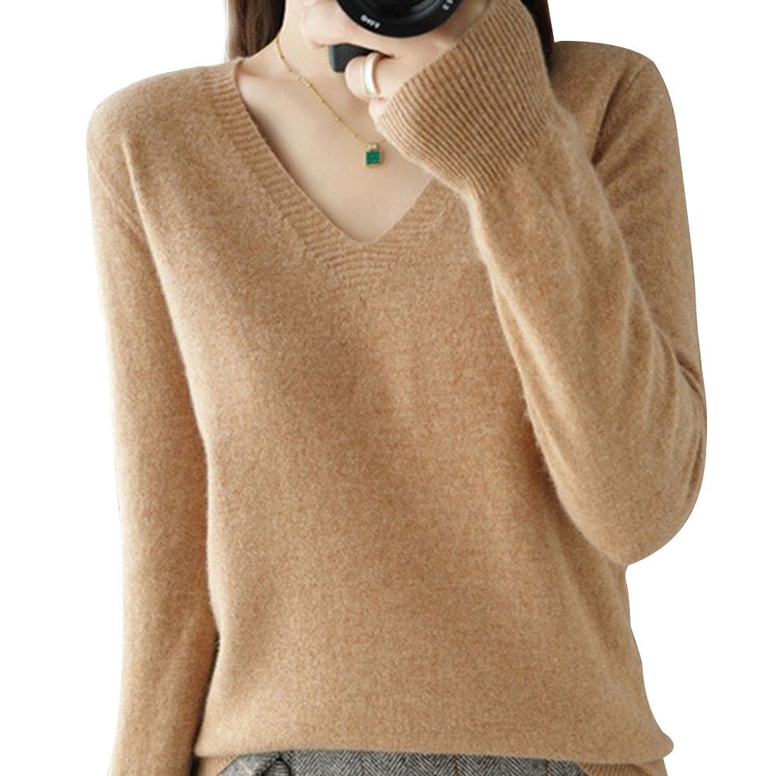 - Vネックセーター レディース プルオーバー 無地 ウールセーター ニット 薄手 ブラウン 2XLサイズ