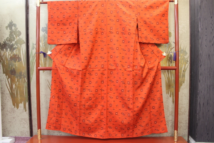 > きもの今昔6264 ウールのきもの バチ衿単衣仕立て 後染絣柄(染ウール) 赤色地に黒の絣染柄 身丈148cm