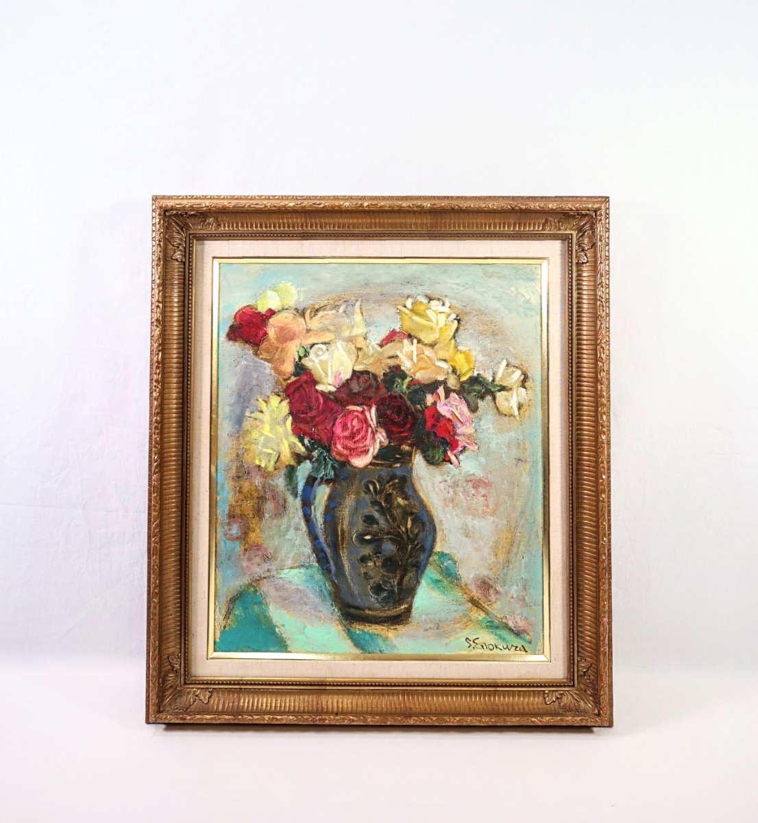 - 真作 榎倉省吾 油彩「花瓶に薔薇」画寸 F10 兵庫県出身 行動美術協会結成会員 鍋井克之に師事 具象と非具象の狭間に感じる世界を表現 8398