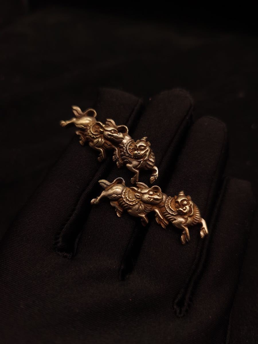 > s-049 双麒麟図目貫 容彫 金色絵 日本刀 武具 刀装具 銅製 小道具 鍔 目貫 縁頭 拵 長 4.1CM