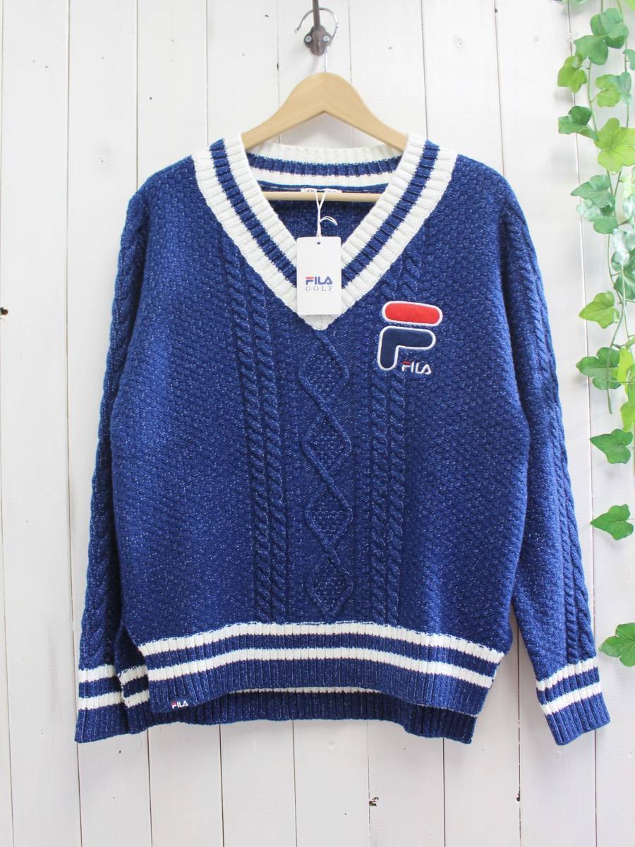 - 新品*FILA GOLF/フィラゴルフ*Vネック ライン入り ケーブルニット ネイビー (5L) 定価10,800円