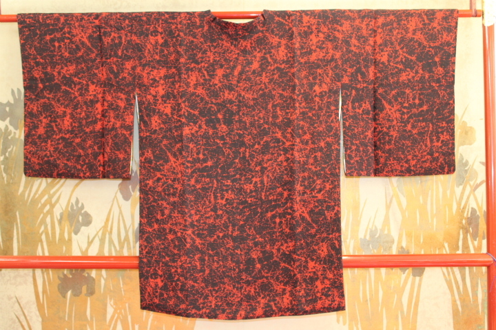 - きもの今昔6501 道行コートコレクション 正絹紋意匠生地 黒赤色糊ひび割れ模様 コート丈85cm