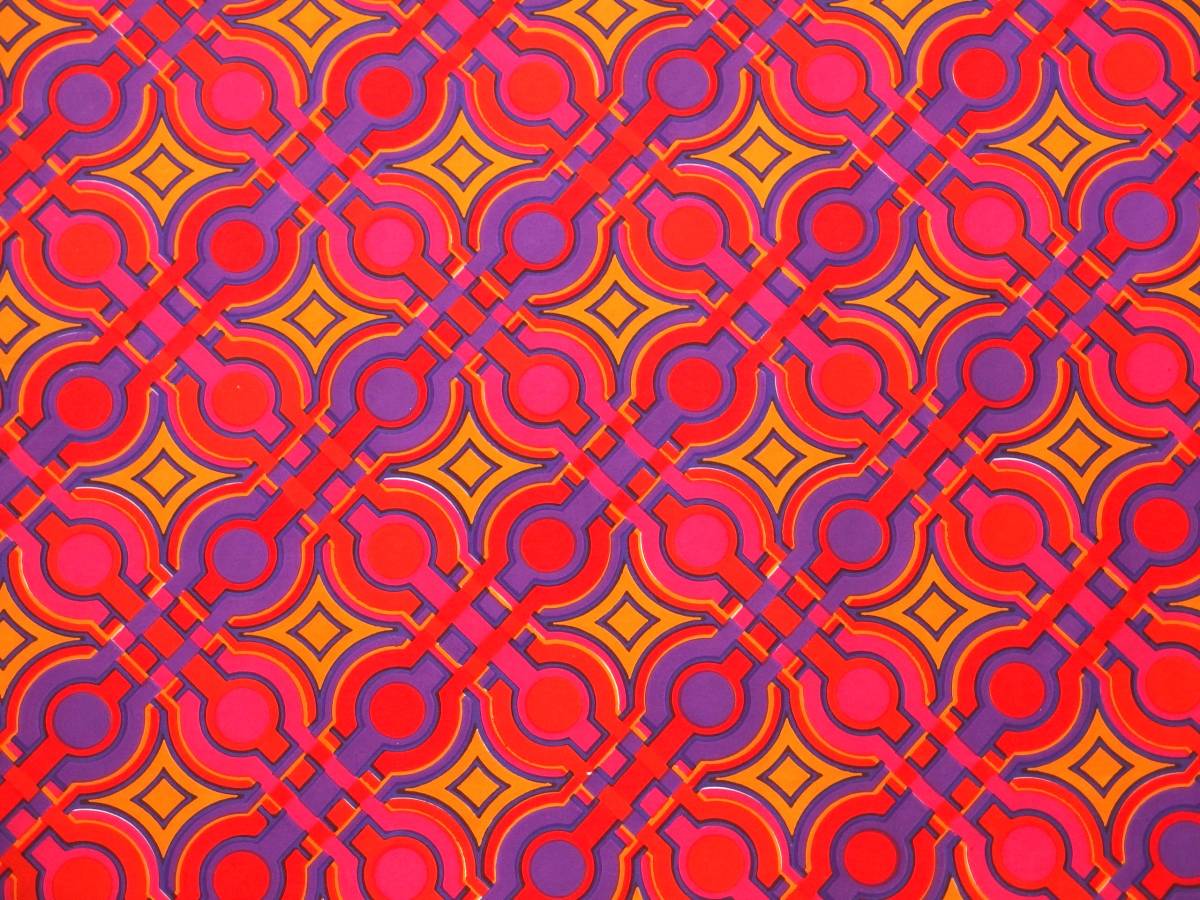 - スイス製 ヴィンテージ&レトロ ワックスペーパー,包装紙 (ピンク、オレンジ&パープルの幾何学模様) 50cm X 50cm