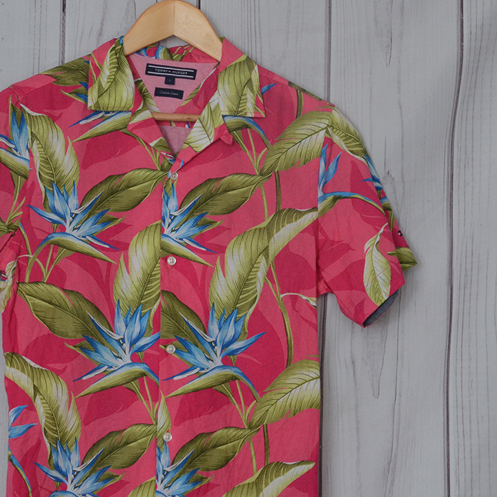 - AA5439 トミーヒルフィガー TOMMY HILFIGER アロハ 半袖シャツ S 肩幅40 リネン メール便可 xq