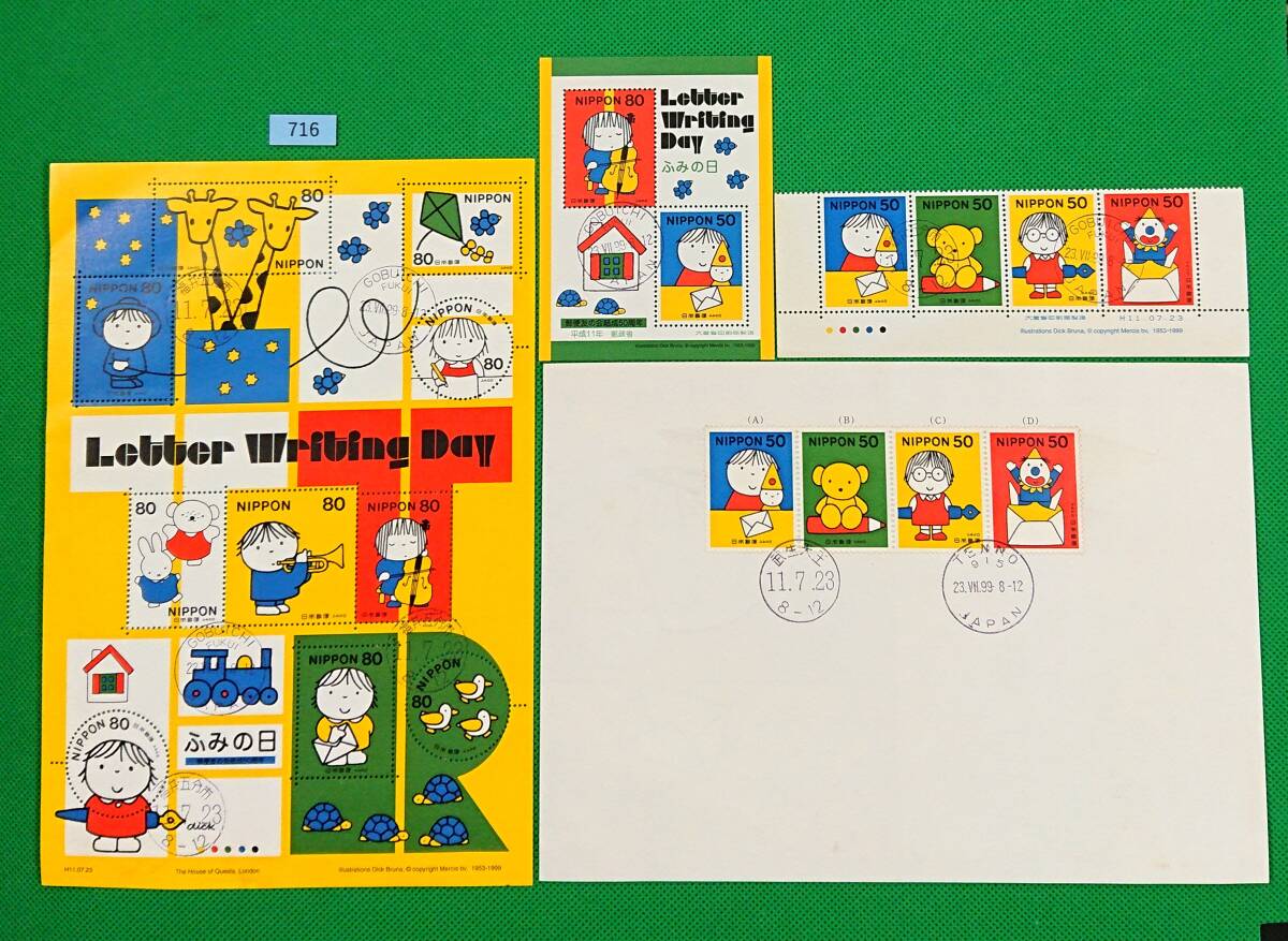 > 初日印/ふみの日/切手シート/小型シート/4種連刷/解説書/1999年/シート裏汚れ有/福井五分市,武生天王,欧文,和文普通印/額面1330円/№716