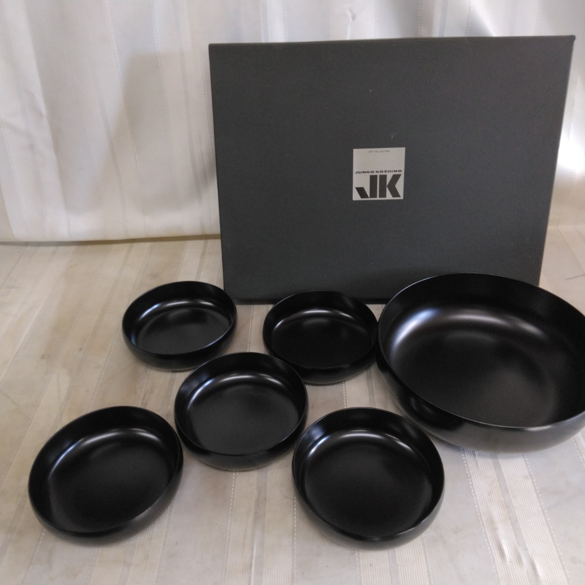 - 美品【JUNKO KOSHINO/ジュンココシノ】サラダボールセット 取り皿 大1個 小5個 黒 ブラック プラスチック JK おしゃれ 箱付