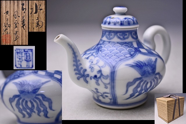 > 眞葛香山 ( 宮川香山 ) ★ 青華 鳳凰書 水滴 ★ 共箱 ★ 希少作 ★ 小品ながら細かく丁寧な絵付が素晴らしい ★ 横浜焼 ★ 真葛香山 書道具