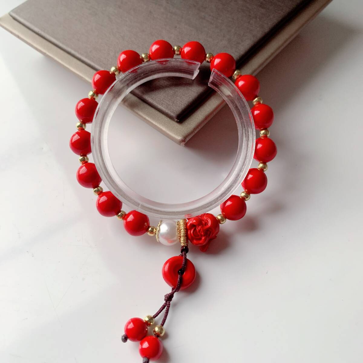 > ◇シナバー(辰砂)◇平安扣+仏頭形◇お守り◇ブレスレット◇パワーストーン◇巾着袋付き◇プレゼント027B31704