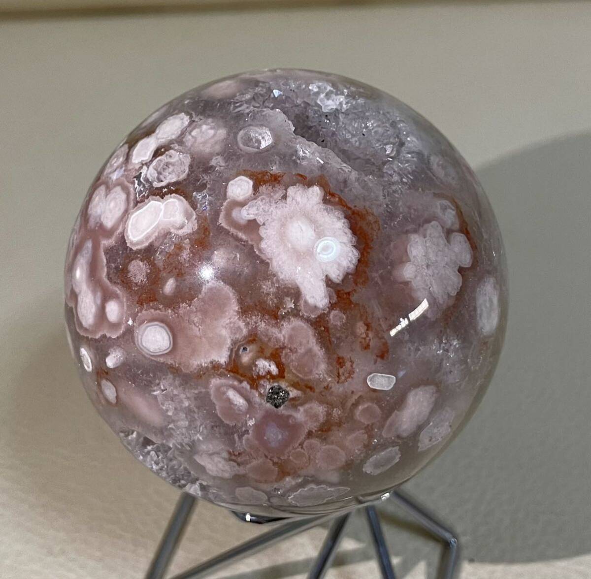 - 桜アゲート フラワー瑪瑙 恋愛運 009 桜模様 パワーストーン 置物 幸運 ラッキー ジオード 天然石スフィア 丸玉風水晶 魔除 お守 水晶共生