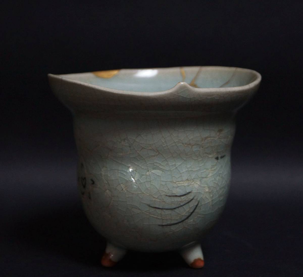 - 【閑】茶道具 李朝 高麗青磁象嵌『雲鶴文』広口香炉 三足 金継ぎ 書道具★時代物★4D0915