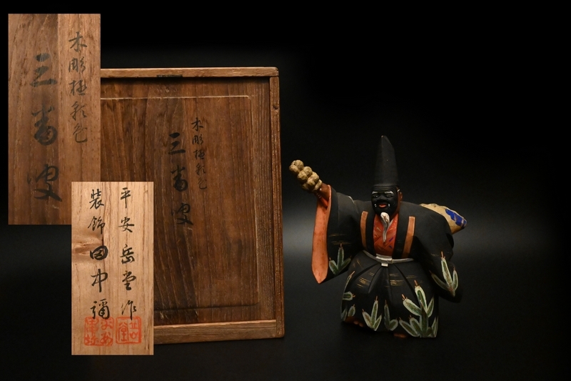 - 木彫人形 平安岳堂 作■三番叟 木彫 鶴亀 彩色 [装飾 田中彌] 能 翁 在銘■1940年 皇紀二千六百年[記念か]五穀豊穣 木箱 №9635■
