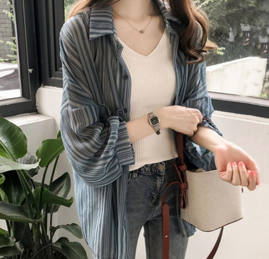 > 春夏新作 / ロングシャツ ブラウス トップス UVカット シフォン 薄手アウター ドルマン 大きいサイズ 長袖 シャツブラウス / ブルー
