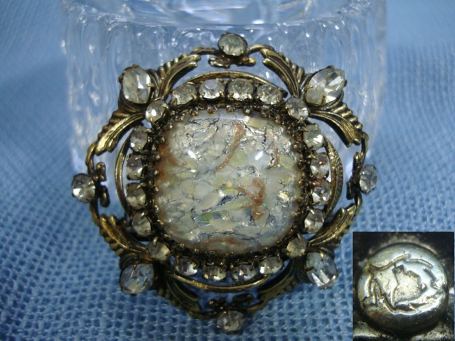 - セビアン ホワイト ガラス ビジュー ラインストーン ブローチ C'EST BIEN ビンテージ コスチュームジュエリー