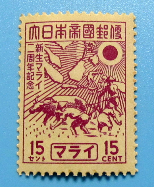 - 南方占領地切手 マライ 新生マライ2周年記念 大日本帝国郵便 15セント 15C 丸まり 裏のり弱い 少しヤケ 未使用