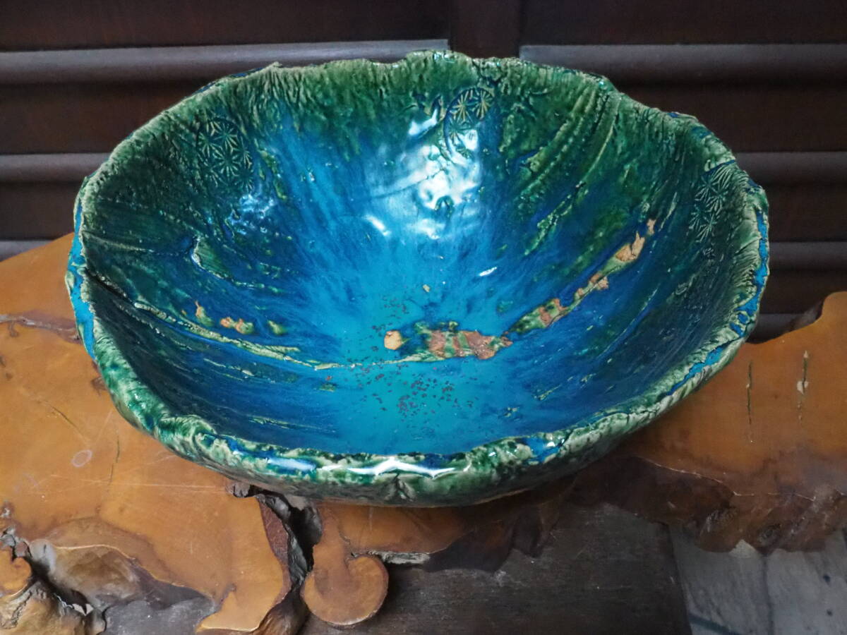 - 【織部加飾尺ボウル鉢 散】陶製美濃焼和食器割烹懐石料理花瓶茶道豆皿焼き物旅館茶室花入れ古道具アンティーク古民家インテリア骨董古民具